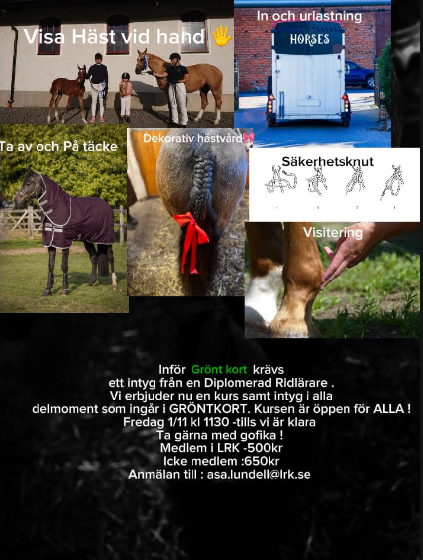 Lidköpings ridklubb bjuder in till en kurs samt intyg till alla delmoment som ingår i gröntkort. 20 november 202419 oktober 2024 av Jeanette Johansson 1/11-2024 kl 11.30 – tills vi är klara Anmälan till Åsa