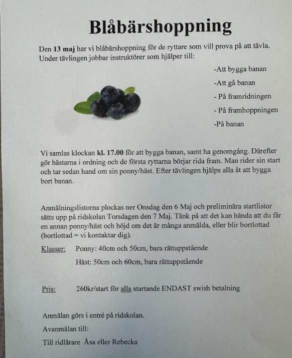 OBS! Starttider och uppgiftslistor för klubbdressyren kan komma att ändras fram till lördag 260502 kl. 19.00.