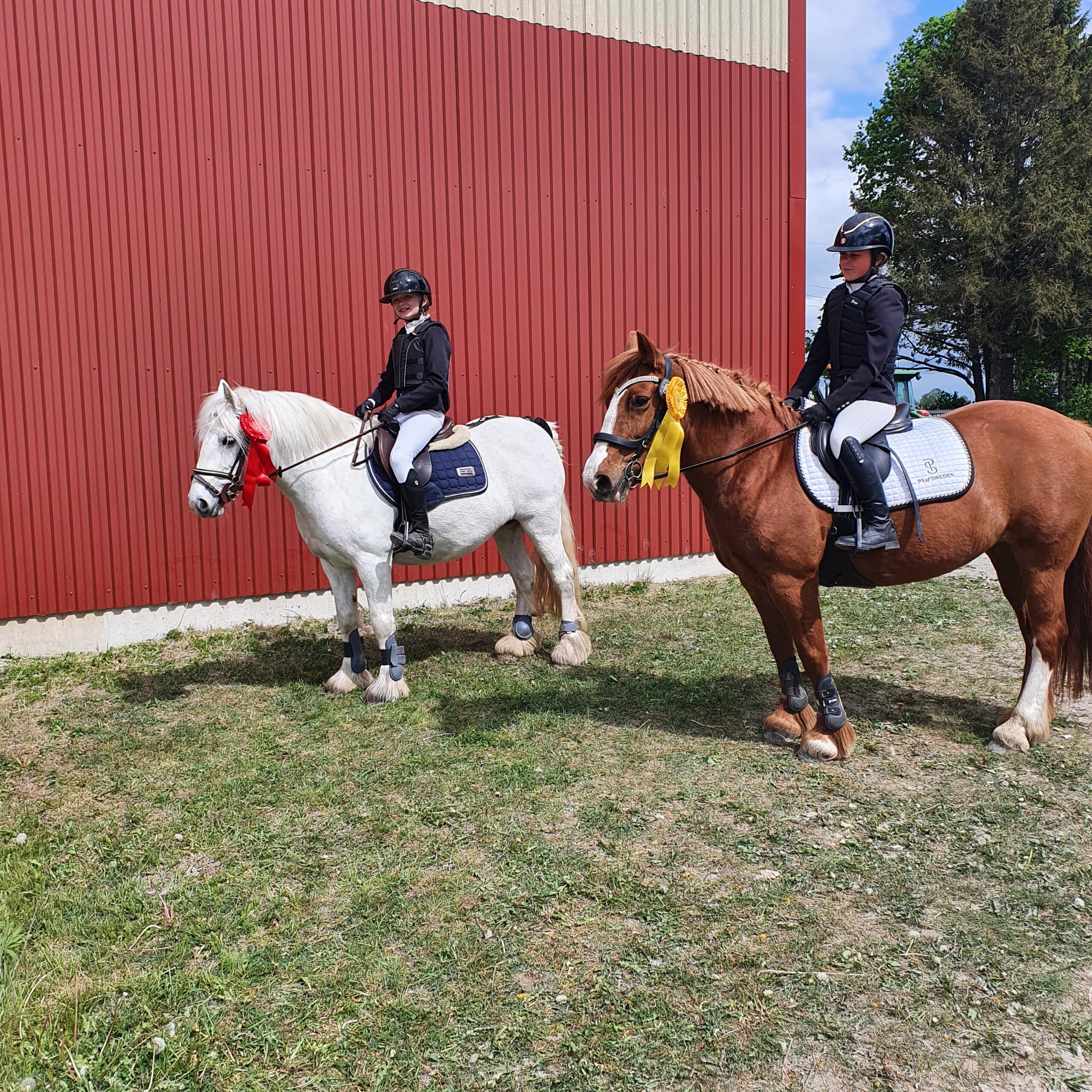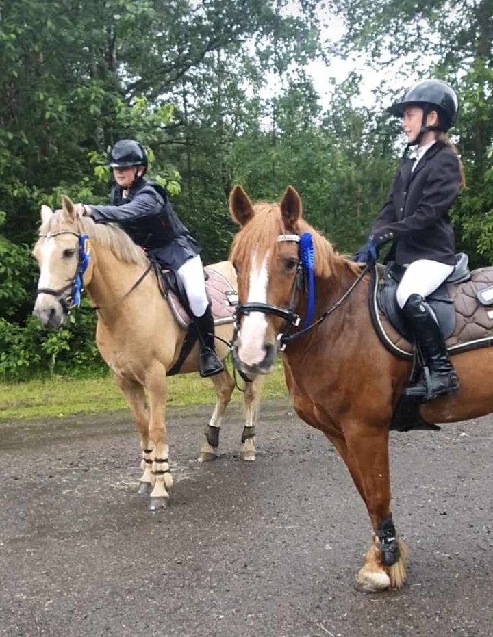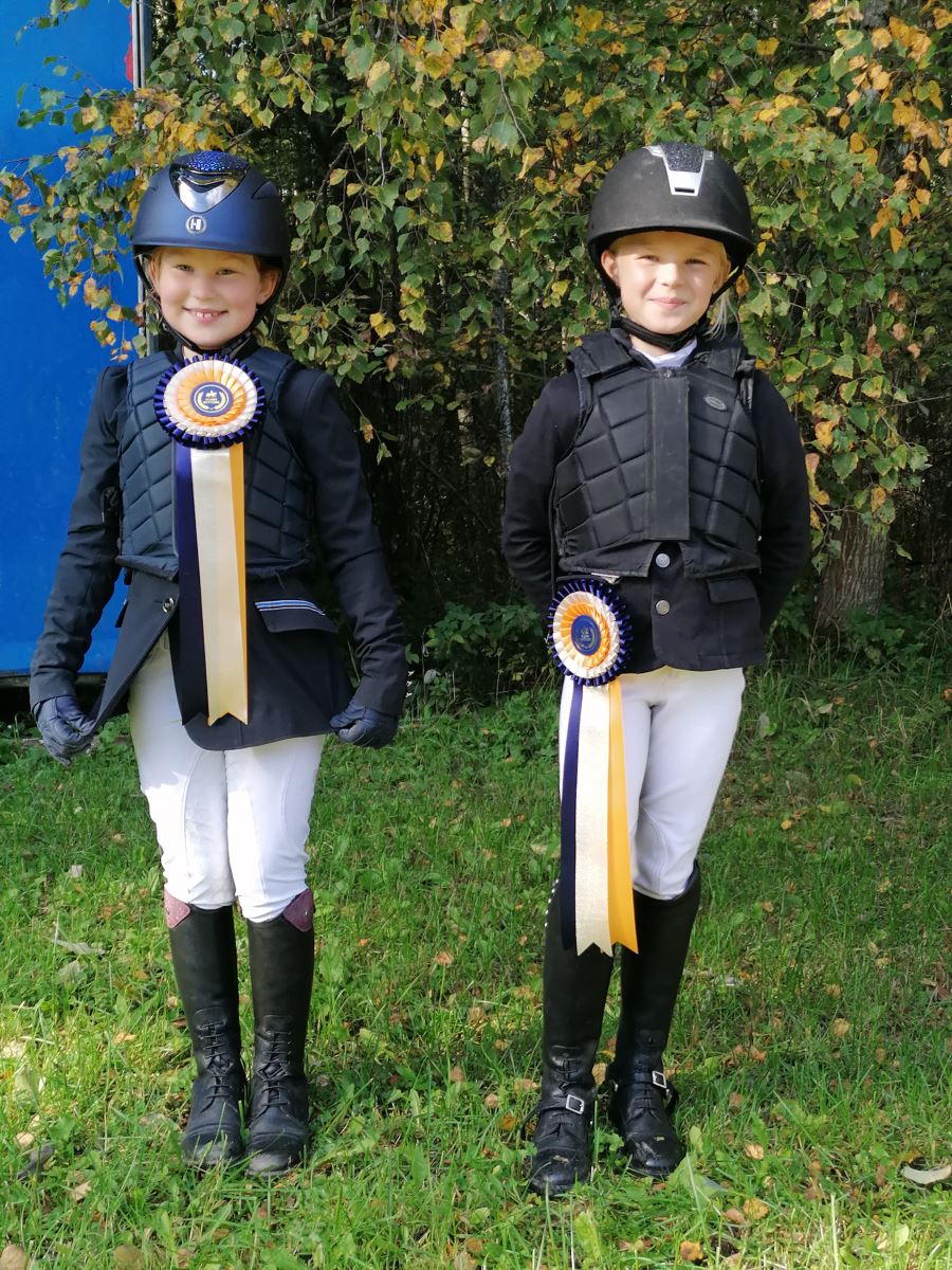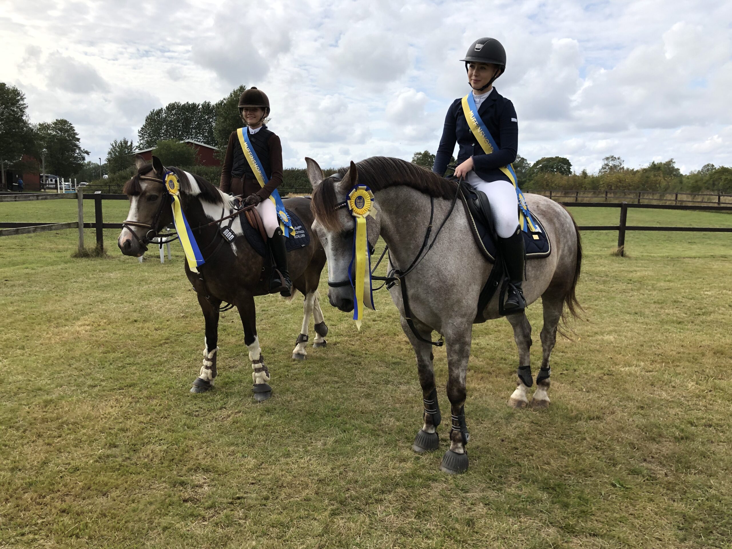 T.v. Stina Krook på Pralin som kom 2:à och till höger Sanna Bolander på Brave Heart, klubbmästare på ridskoleponny
